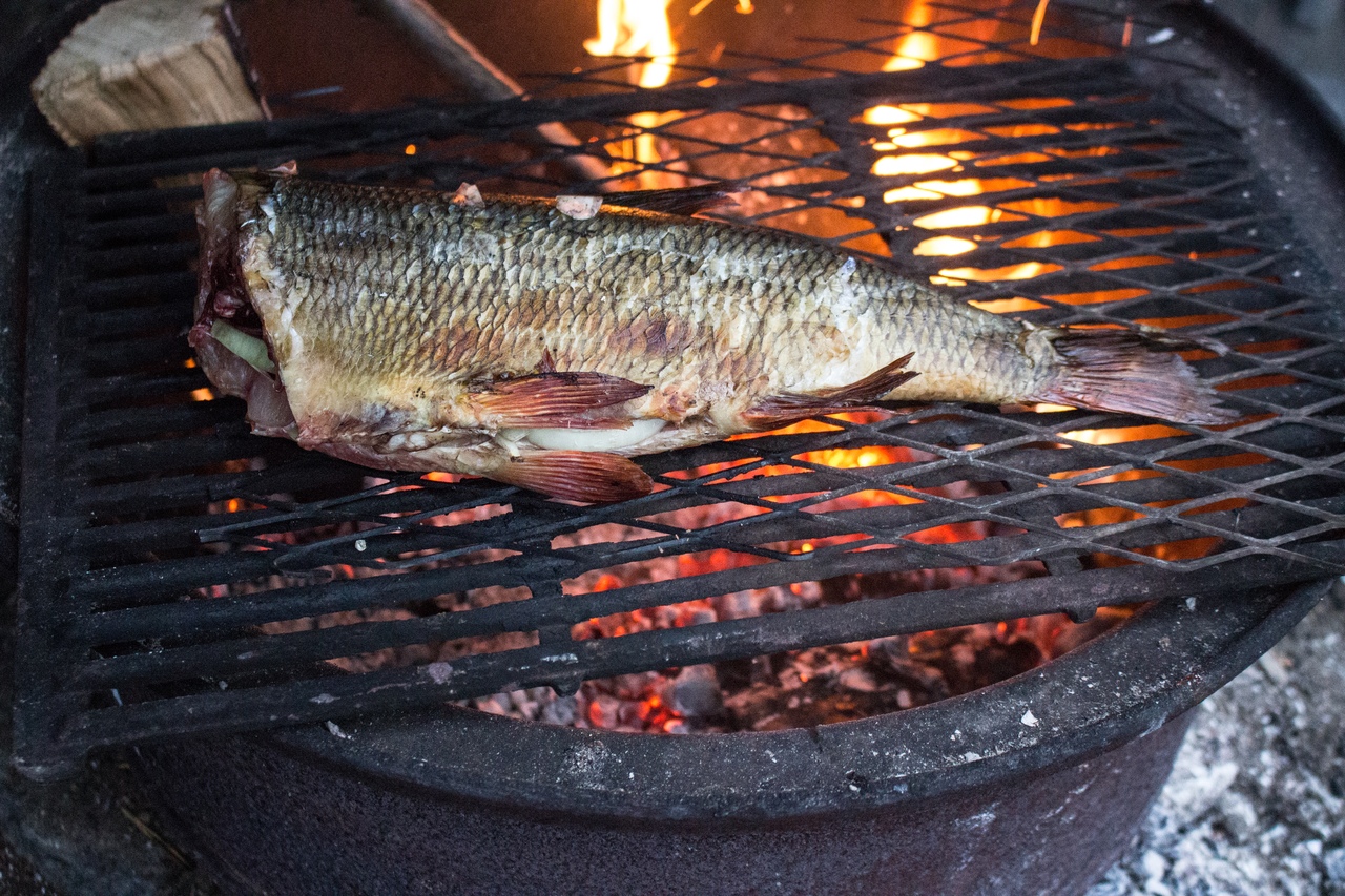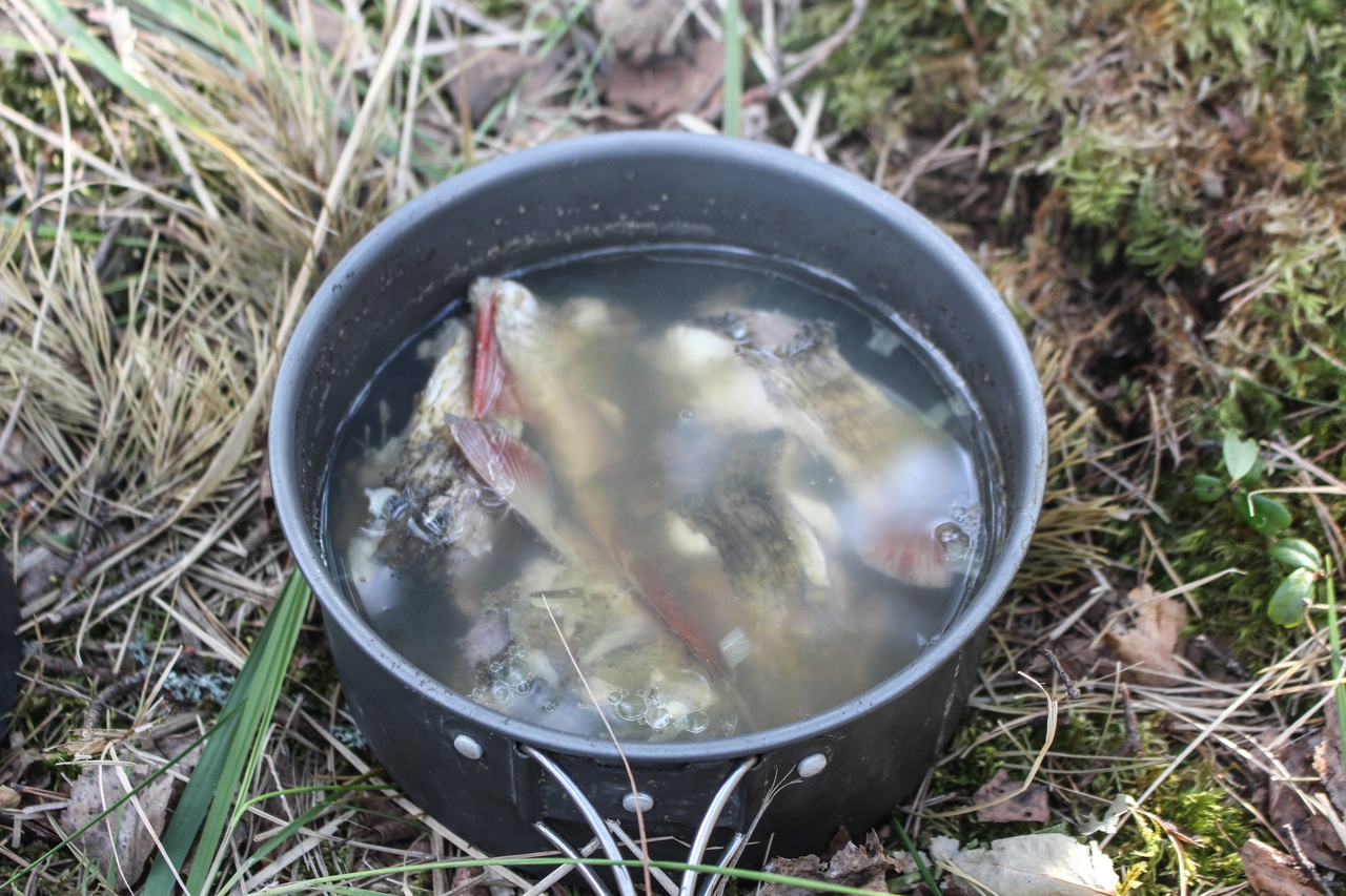 Женя поймал язя и приготовил уху.