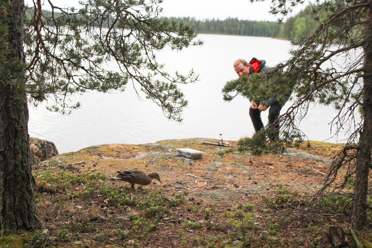 Женя рыбачил у нашего лагеря, к нему пришла белочка уточка, совершенно бесстрашная.