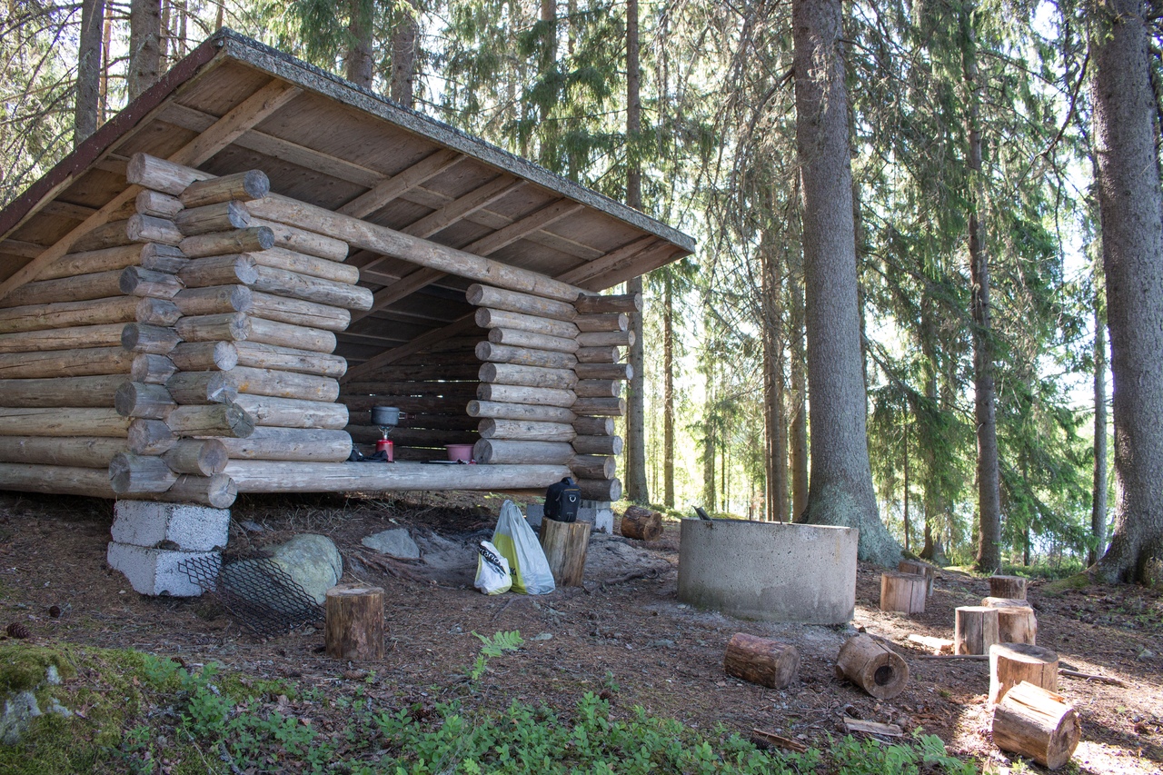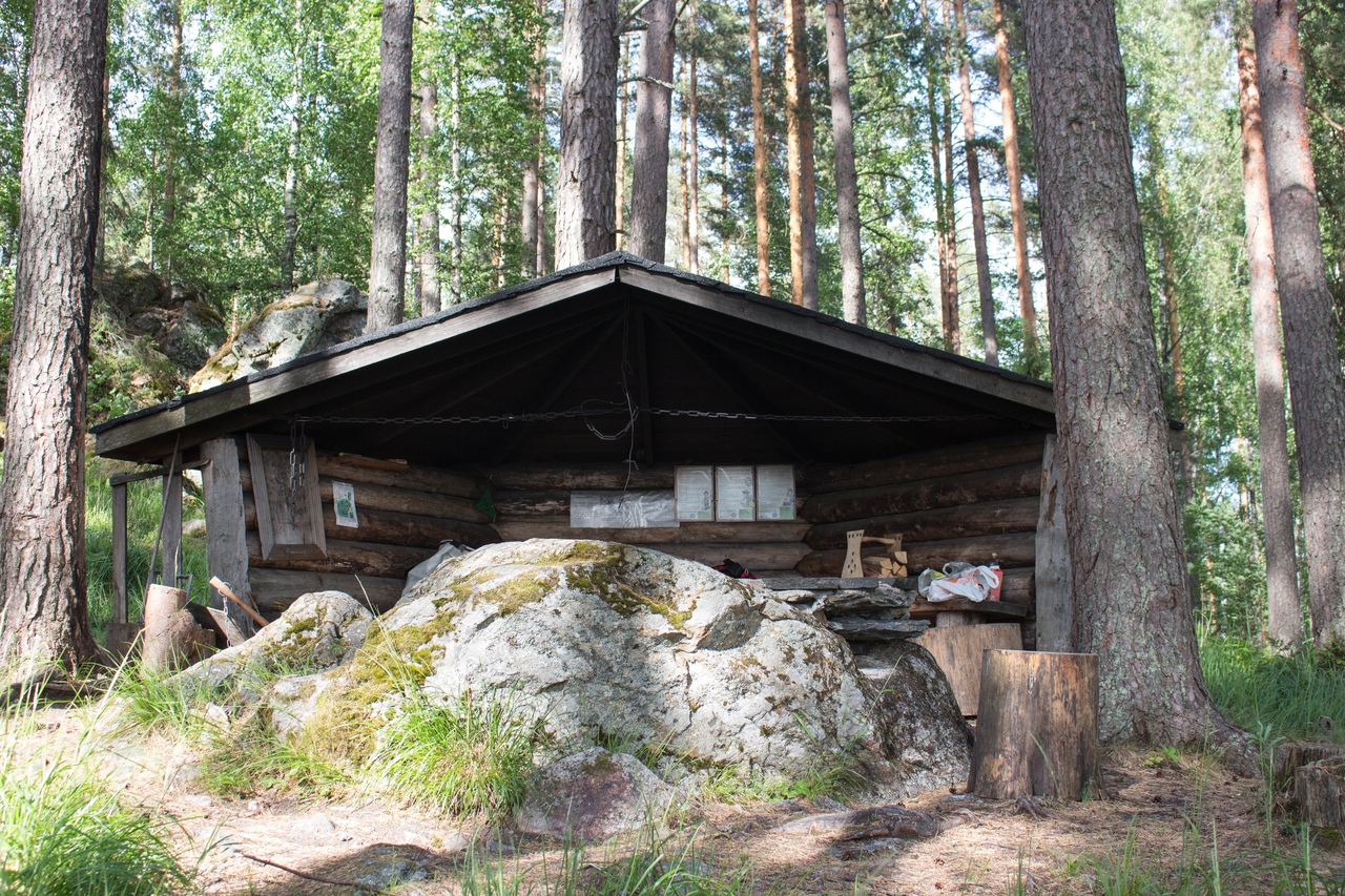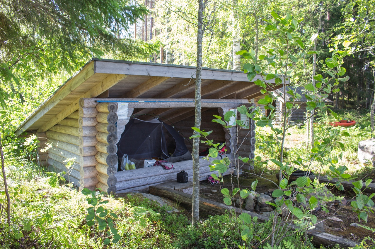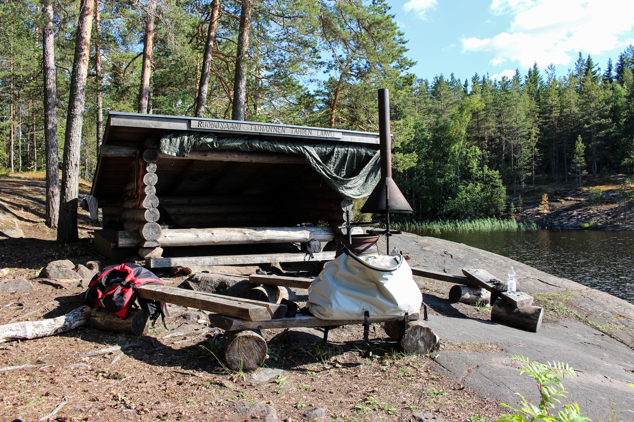 В итоге чуть дальше по маршруту на полуостровке Васиккасаари (Телячий остров) случайно обнаружили навес, не обозначенный на карте. Вот там и решили переночевать.