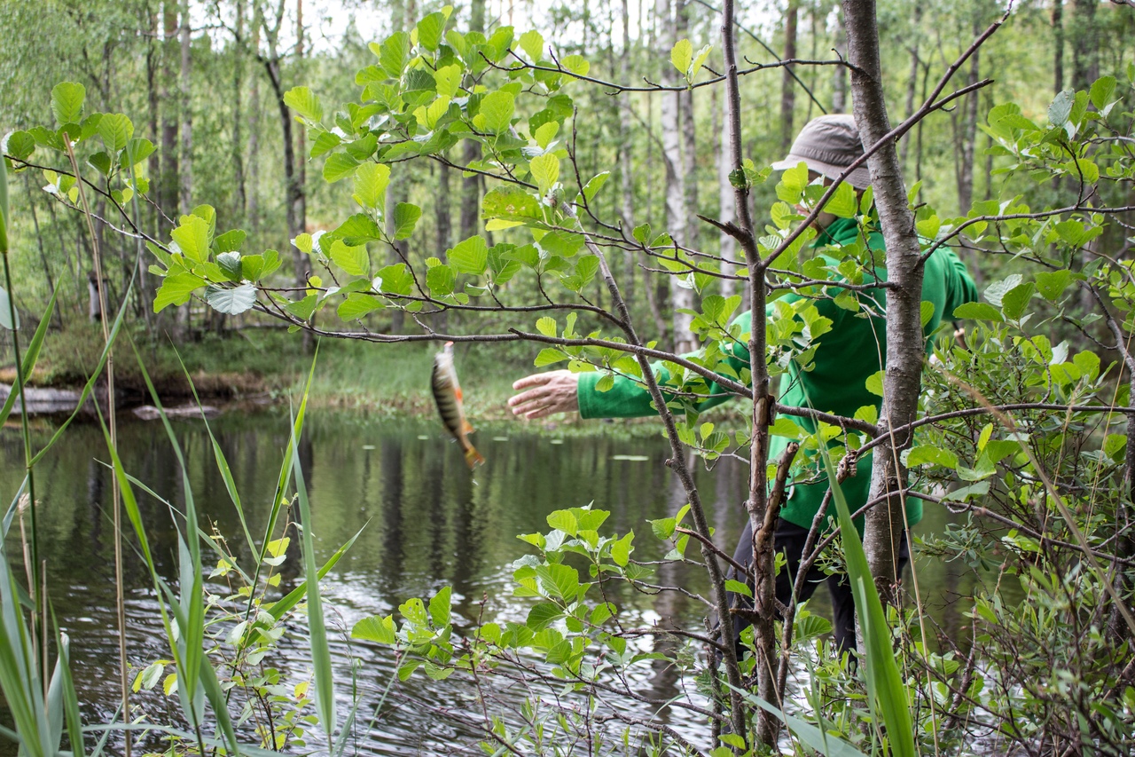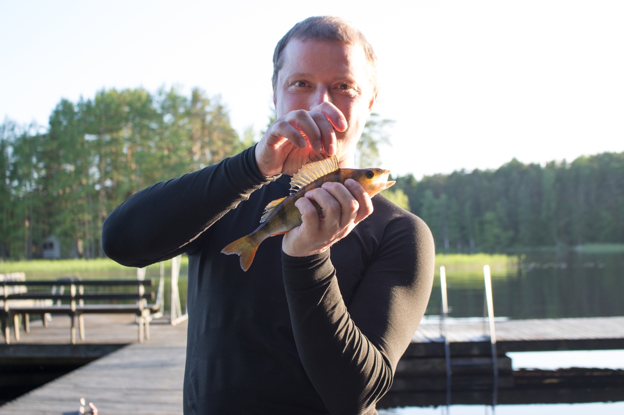 мостков Женя поймал двух окуньков. Поймал и отпустил, в вечернем меню рыбных